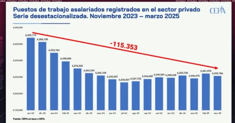 Otro informe del Centro de Economía Política Argentina (CEPA), indica que desde el inicio de la presidencia de Javier Milei, la pérdida acumulada es de más de 115 mil empleos.