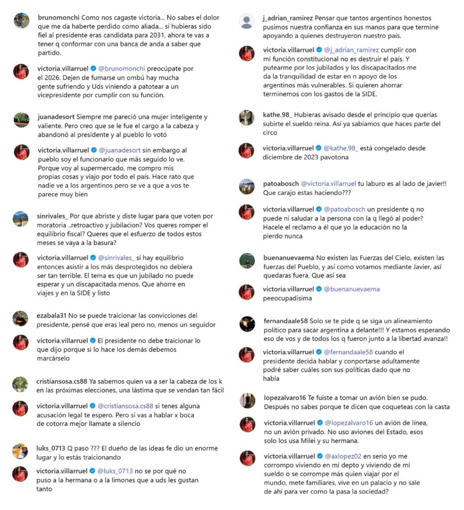 La polémica continuaría durante el fin de semana, días en los que Victoria Villarruel recibiría una catarata de comentarios en su cuenta de Instagram. Todos cuestionando su integridad y labor como funcionaria del ejecutivo nacional. Lo llamativo fue que la Vicepresidenta no dudó en responder varios de esos mensajes y lejos de “calmar las aguas”, lo hizo exponiendo aún más el quiebre de su relación con el Presidente de la Nación.